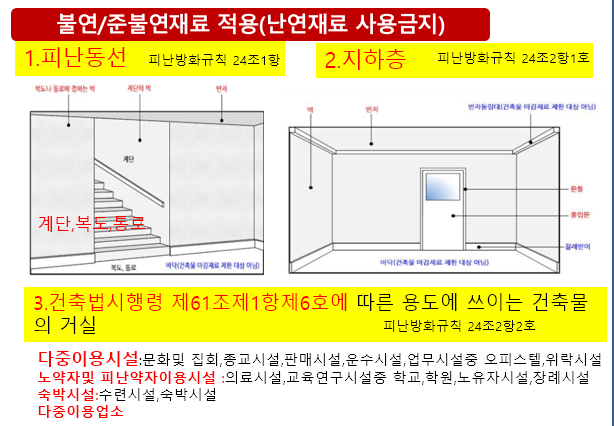다만, 다음 각 호에 해당하는 부분의 마감재료는 불연재료 또는 준불연재료를 사용해야 한다.