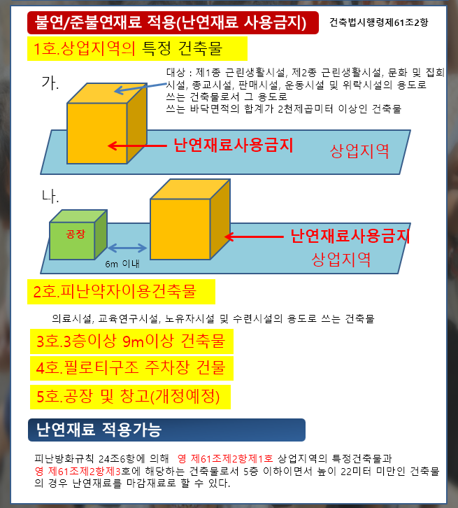 제52조② 대통령령으로 정하는 건축물의 외벽에 사용하는 마감재료는 방화에 지장이 없는 재료로 하여야 한다.