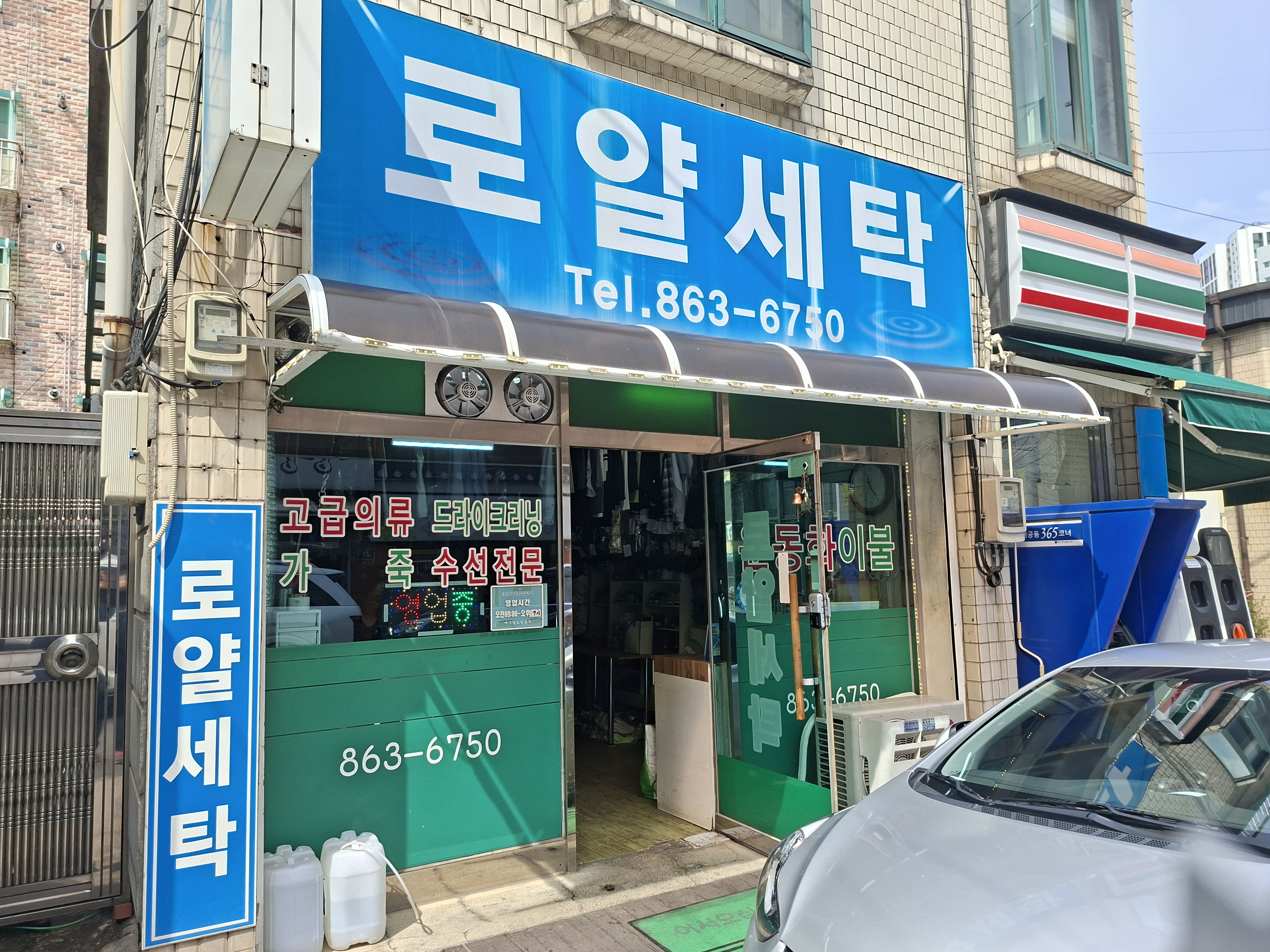 시장의 활기찬 분위기를 지나 골목으로 조금만 들어오면, 세월의 멋이 느껴지는 타일 건물 1층에 자리 잡은 파란 간판을 발견하실 수 있을 거예요. 멀리서도 '로얄세탁'이라는 선명한 글씨가 눈에 띄어 찾기 어렵지 않았답니다.
