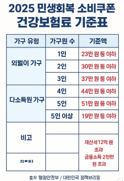 - 본인 및 가구 건강보험료 합산 금액이 기준 이하일 경우