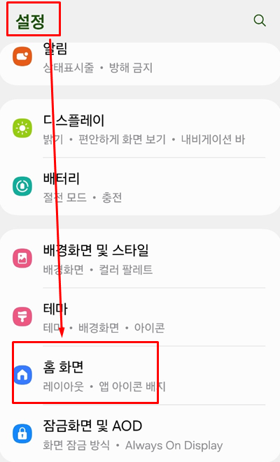 핸드폰 톱니바퀴 누르고 홈화면에 앱스 버튼추가 활성화 먼저 해주세요