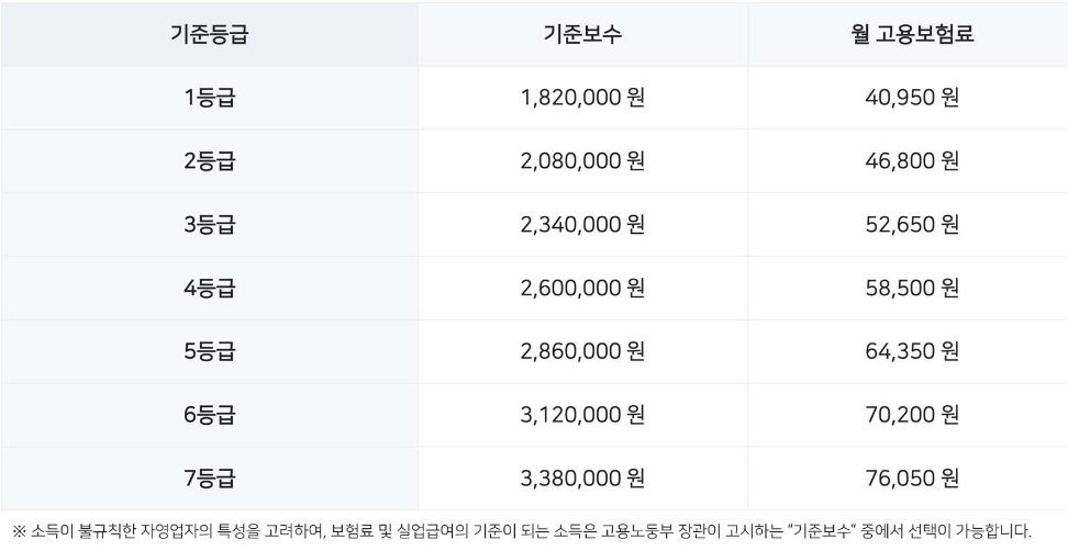1등급 기준보수액은 182만 원으로 월 고용보험료는 40,950원이며,