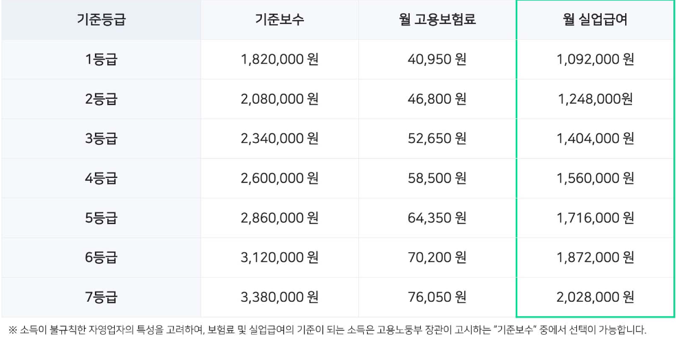 1등급 기준보수액의 월 실업급여는 91만 원, 7등급 기준보수액의 월 실업급여는 169만 원이에요.