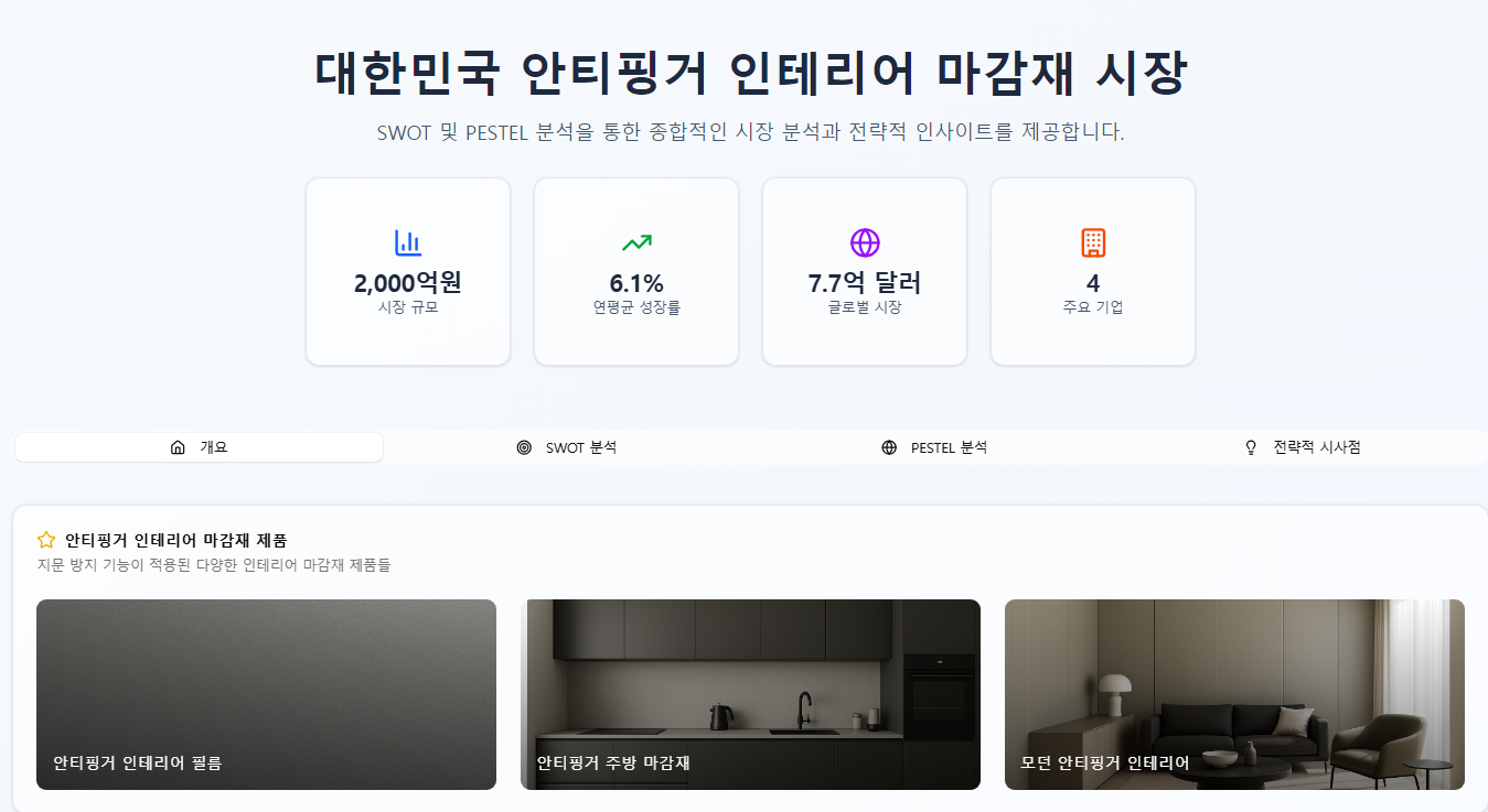 분석 프레임워크로는 SWOT 분석과 PESTEL 분석을 결합하여 시장의 내외부 환경을 종합적으로 평가할 것입니다. SWOT 분석은 기업의 내부 역량(강점, 약점)과 외부 환경(기회, 위협)을 파악하여 전략 수립의 기초를 제공하며, PESTEL 분석은 거시 환경 요인이 시장에 미치는 영향을 체계적으로 분석하는 데 유용합니다. 이 두 가지 프레임워크를 통해 안티핑거 인테리어 마감재 시장의 복합적인 특성을 심도 있게 이해하고, 현실적인 통찰력과 근거 있는 가정을 기반으로 모든 섹션을 완성할 것입니다.