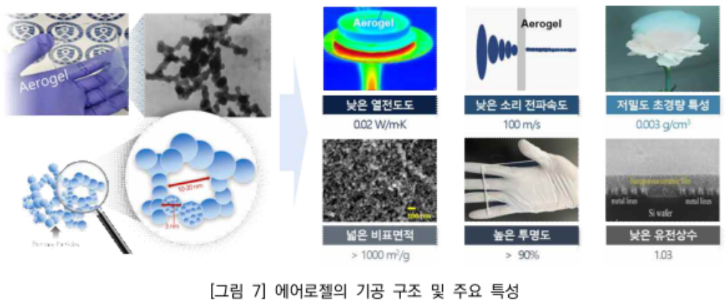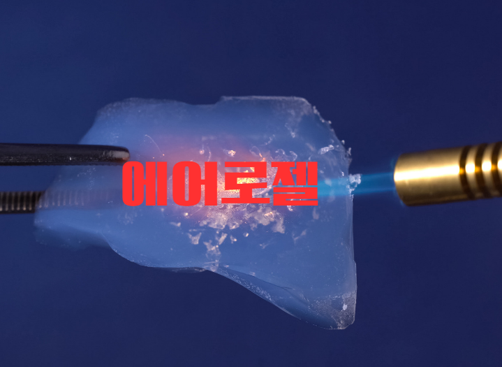 aerogel은 공기 중에서 가장 가볍고 높은 열 저항성을 가진 고체 물질로, 극도로 적은 밀도와 높은 기공률을 가지고 있습니다. 에어로젤은 ‘frozen smoke’라고 불리는 세상에서 가장 가벼운 고체로 내부의 90% 이상이 공기로 이루어진 물질이며, 공기(aero)와 3차원 네트워크 구조(gel)의 합성어에서 기인합니다.