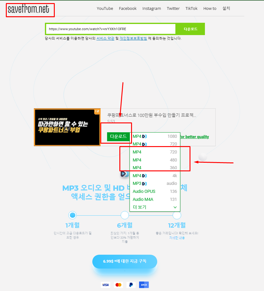 1-2) 낮은 품질로 체크다운로드 : 무료라서 광고가 뜨는데 무시 하시고... mp4 720까지 가능~
