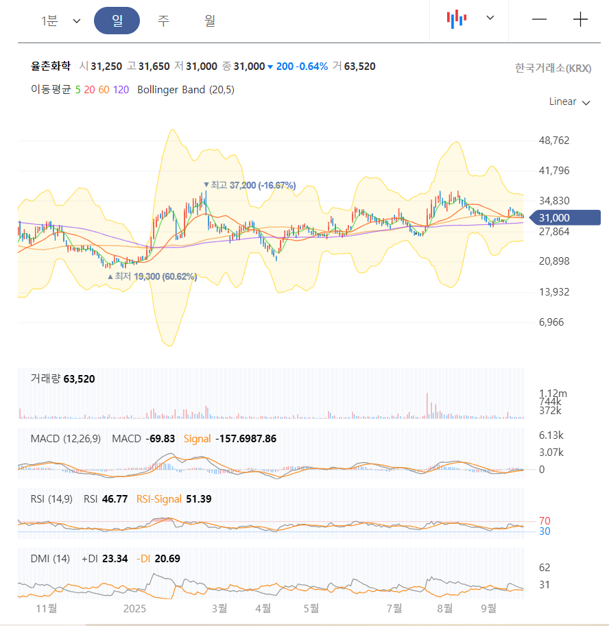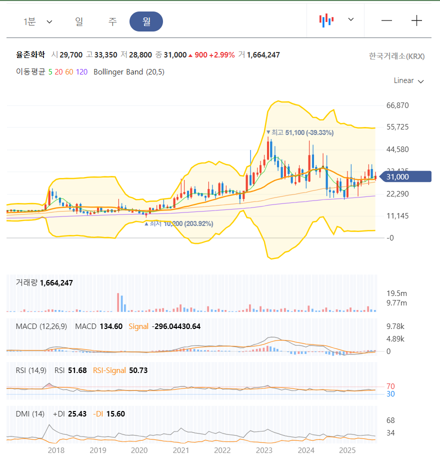• 🔵 **긍정 신호**: 율촌화학의 월봉 차트에서 장기 이평선(20월선, 60월선)의 골든크로스를 찾아보세요. 이 신호는 추세의 근본적인 전환을 의미합니다.