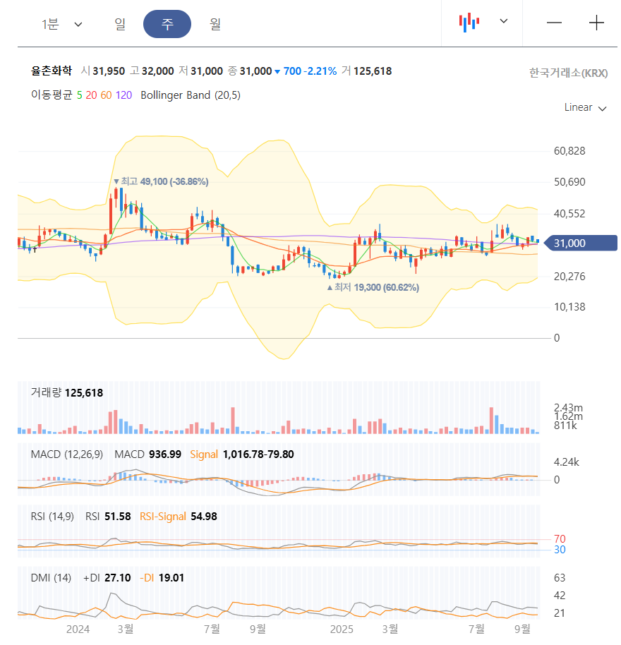 - 🔵 **긍정 신호**: 율촌화학의 월봉 차트에서 장기 이평선(20월선, 60월선)의 골든크로스를 찾아보세요. 이 신호는 추세의 근본적인 전환을 의미합니다.