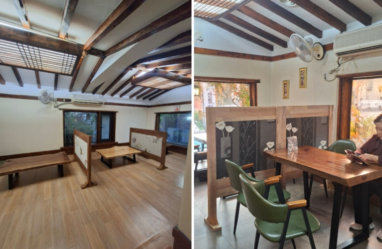 내부로 들어서니 따뜻한 우드톤 인테리어가 차분함을 더해줍니다. 좌식 테이블과 일반 테이블 공간이 칸막이로 잘 분리되어 있어 조용히 대화에 집중할 수 있는 분위기였어요. 마치 시골 할머니 댁에 놀러 온 듯 마음이 편안해지는 느낌이었습니다.