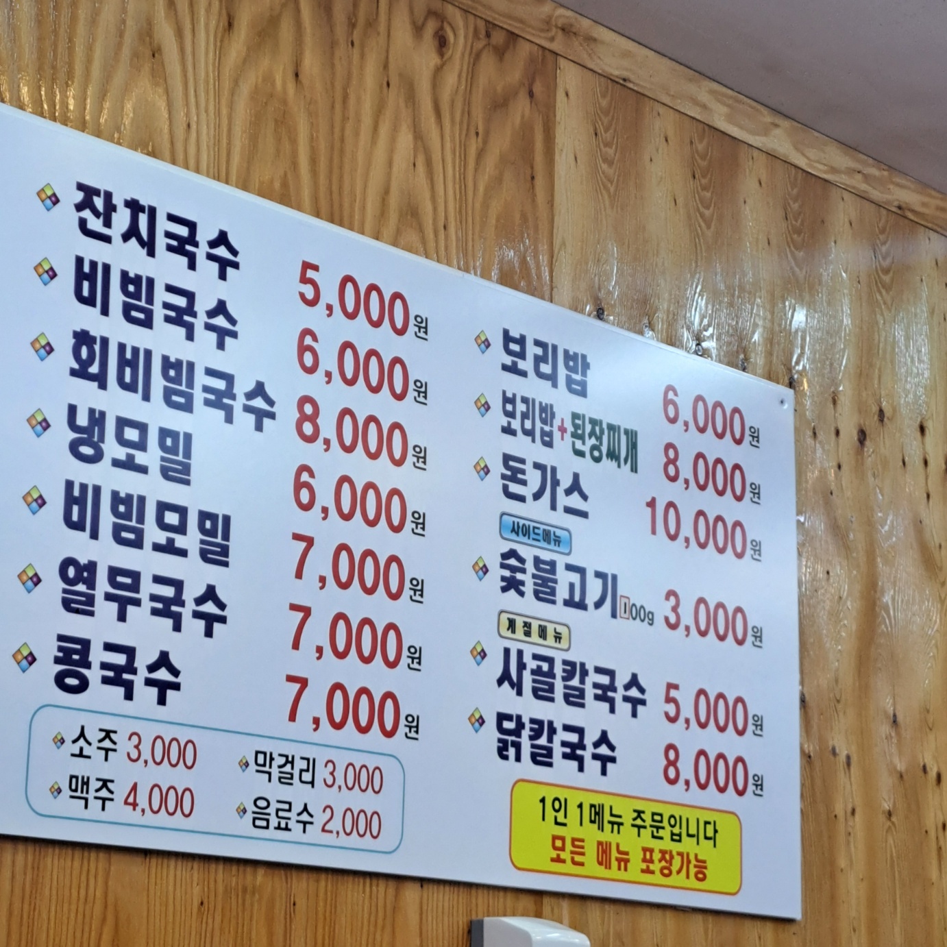 다양한 면 요리와 든든한 식사 메뉴들이 준비되어 있었어요. 메뉴판을 보니 군침이 절로 돌더라고요. 엄마는 건강하고 든든한 한 끼를 위해 '보리밥+된장찌개'를 선택하셨고, 저는 매콤하면서도 시원한 맛이 당겨 '비빔국수'를 주문했답니다.
