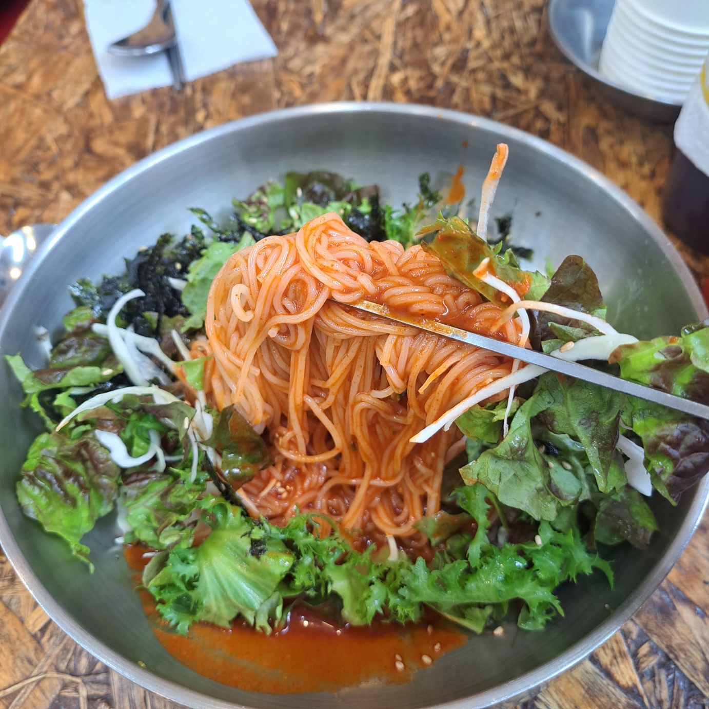 다음으로 제가 주문한 '비빔국수'에요! 알록달록 신선한 채소와 김가루, 그리고 윤기 좌르르 흐르는 양념장이 보기만 해도 침샘을 자극했어요. 새콤달콤한 양념과 쫄깃한 면발이 정말 환상의 조화였답니다. 한 젓가락 먹을 때마다 감탄사가 절로 나왔어요!