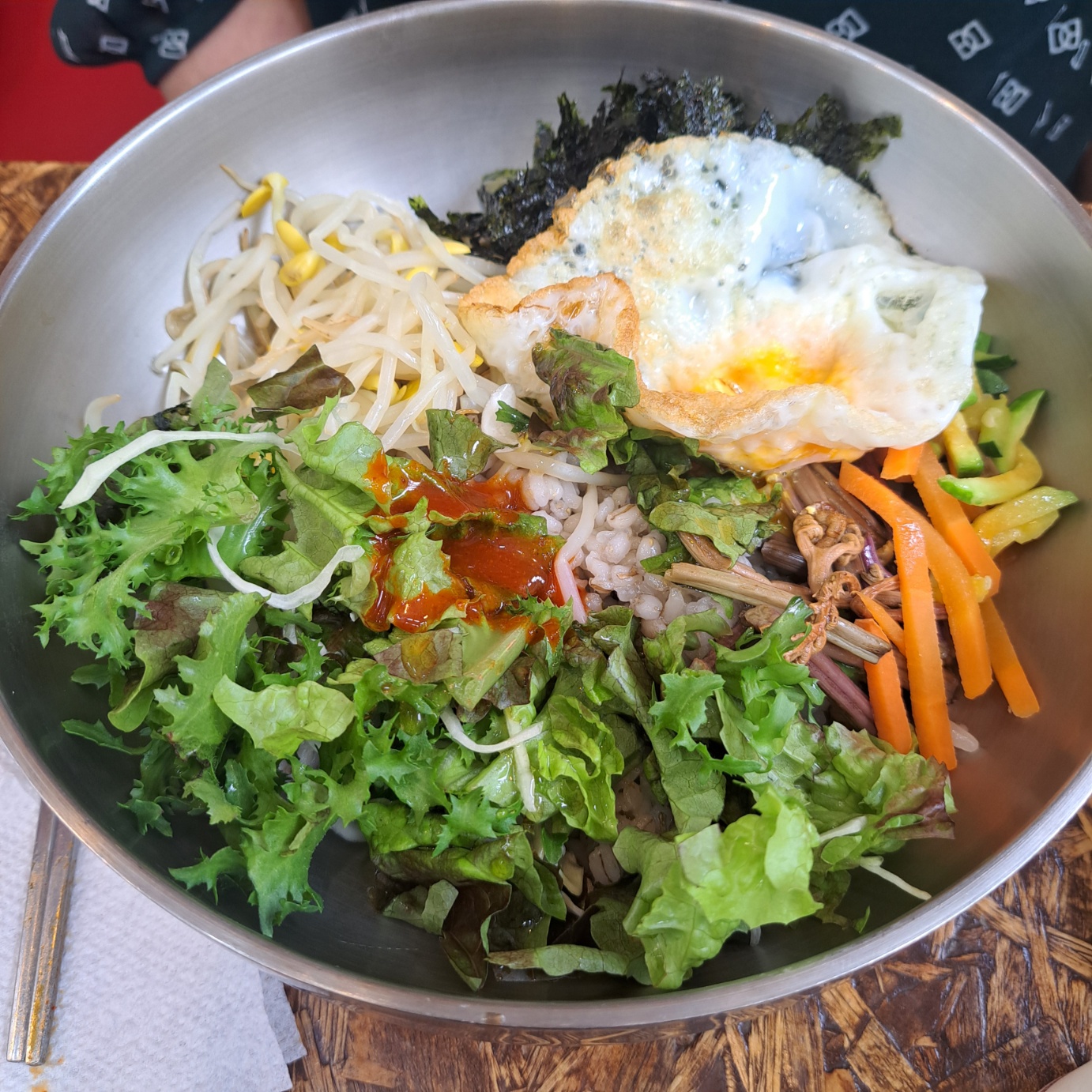 먼저 엄마가 주문하신 '보리밥+된장찌개'가 나왔어요. 비빔밥 재료들이 그릇 가득 푸짐하게 담겨있고, 함께 나온 된장찌개는 구수하고 깊은 맛이 일품이었답니다. 신선한 채소들과 고슬고슬한 보리밥, 그리고 따뜻한 된장찌개까지 완벽한 한 상이었어요.