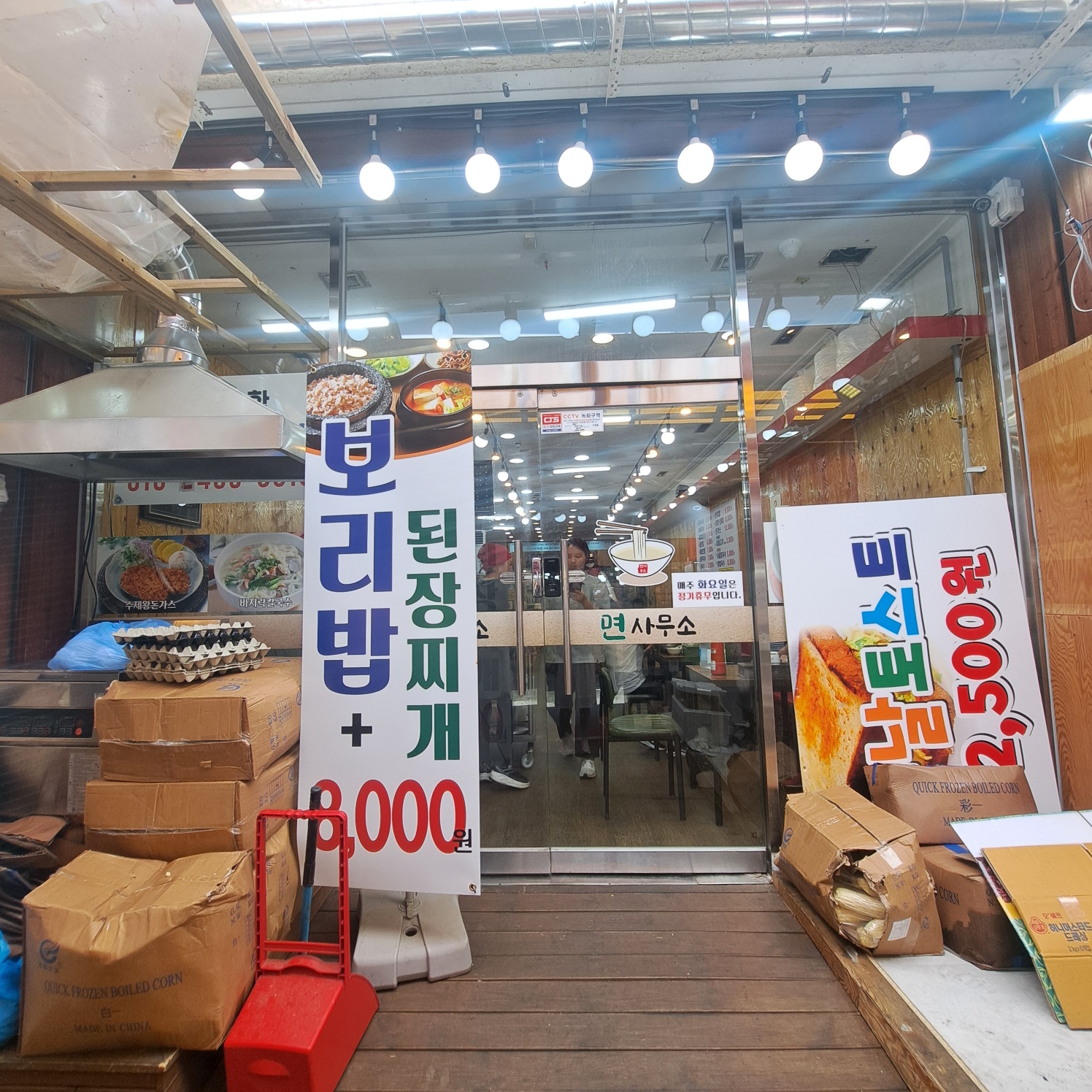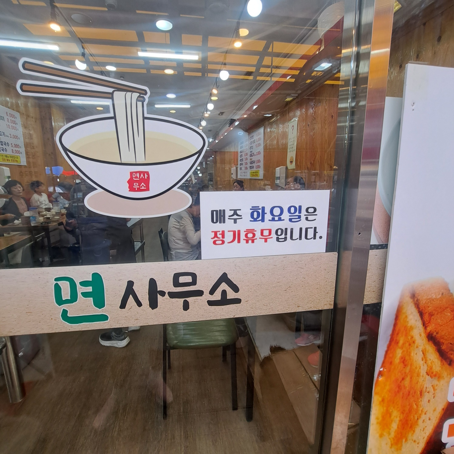 '면사무소'는 모래내시장 남문 근처, 파리바게트 모래내시장점에서 가까워요 그래서 찾기 쉬웠어요. 비가 오는 날씨였는데도 뜨끈한 국물이나 시원한 면 요리를 찾는 손님들로 가게 안은 활기가 넘쳤답니다. 유리창 너머로 보이는 깔끔한 내부가 인상적이었어요.