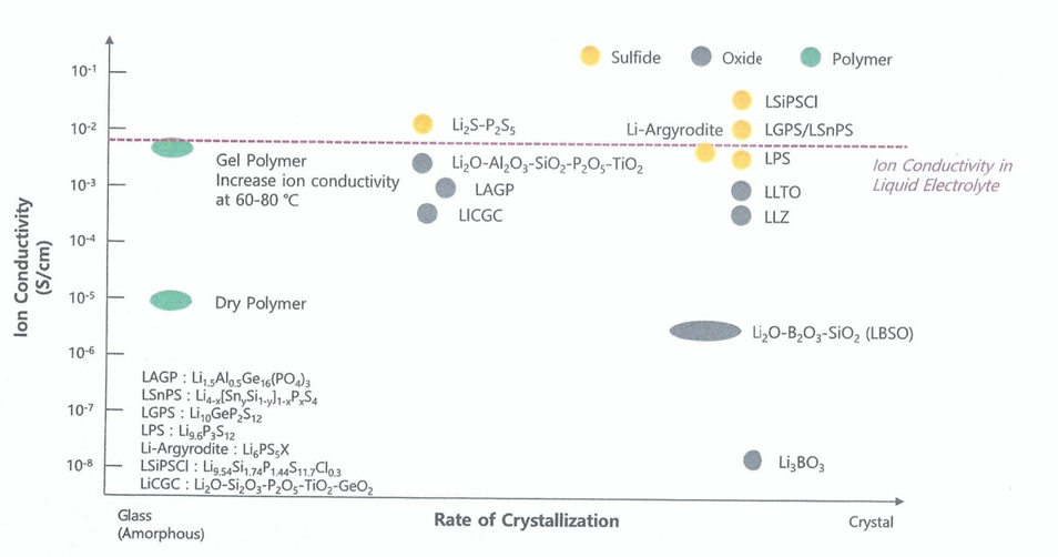 주요전고체저지용 고체전해질 소재 : Sulfide(황화물), Oxide(산화물), Polymer(고분자)