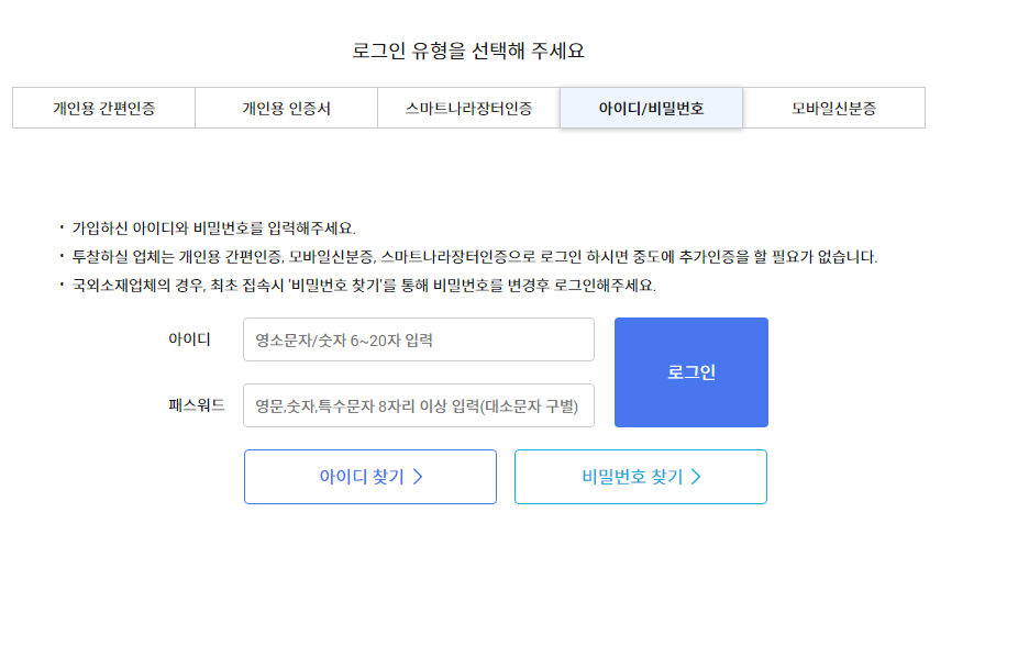 개인 아이디나 개인 인증서로 들어갈수 있어요