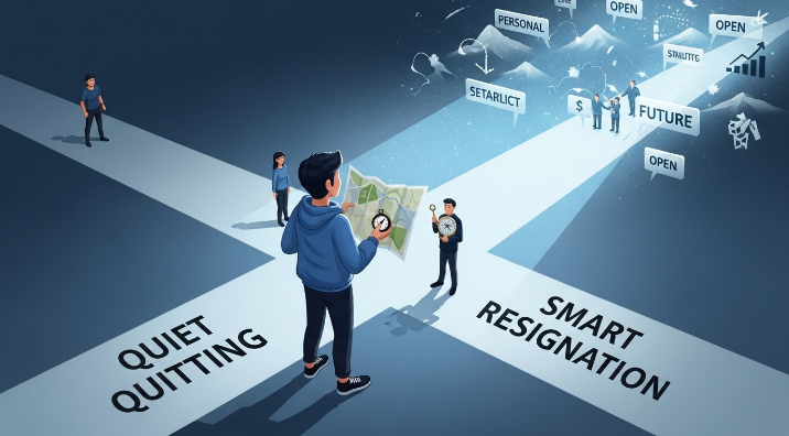 A1: '조용한 퇴사'는 현재 직장에서 최소한의 업무만 하며 심리적 거리를 두는 소극적인 태도인 반면, '똑똑한 퇴사'는 현재 직장을 벗어나 더 나은 미래를 위해 심리적, 재정적으로 철저히 준비하고 주도적으로 행동하는 적극적인 전략입니다. 똑똑한 퇴사는 단순히 회피가 아닌 새로운 기회를 창출하려는 노력입니다.