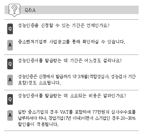 중소벤처기업부에서 중소기업이 개발한 기술개발제품이 성능을 확보하였음을 확인·증명하여 공공기관의 기술개발제품 구매를 지원(성능인증 취득 시 ʻ기술개발제품 우선구매제도ʼ의 대상에 포함)