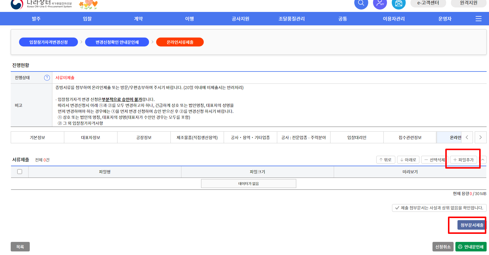 - 나라장터 로그인 > 이용자관리 > 업체정보관리 > 변경신청정보조회 및 신청취소(온라인서류제출) >