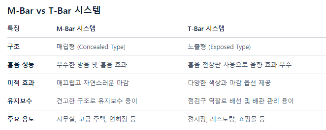 M-Bar 시스템과 T-Bar 시스템은 천장 시공에 사용되는 대표적인 경량 철골 구조 시스템으로, 각각의 특징과 용도에 따라 다양한 건축 환경에서 활용됩니다
