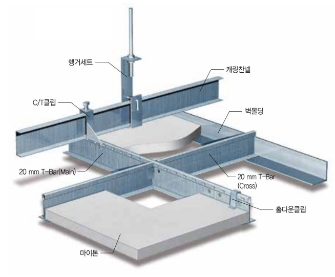 - 격자형 프레임 설치: 천장 구조물 아래에 T-Bar 프레임을 설치.