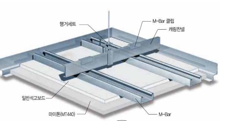 - M-Bar 설치: 클립을 사용하여 M-Bar를 고정하고 천장재를 부착