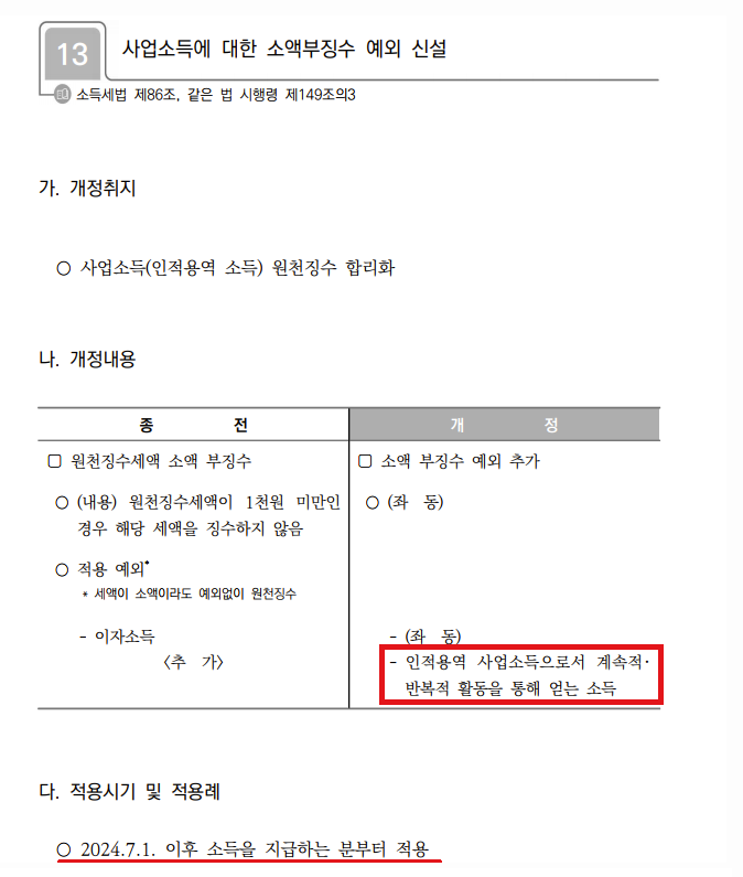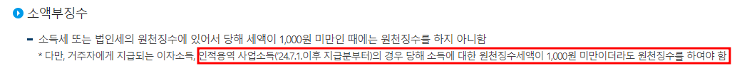 2024년 7월 1일부터 개정된 소득세법이 적용됨에 따라 사업소득의 소액부징수 원천징수 기준이 변경되었습니다.