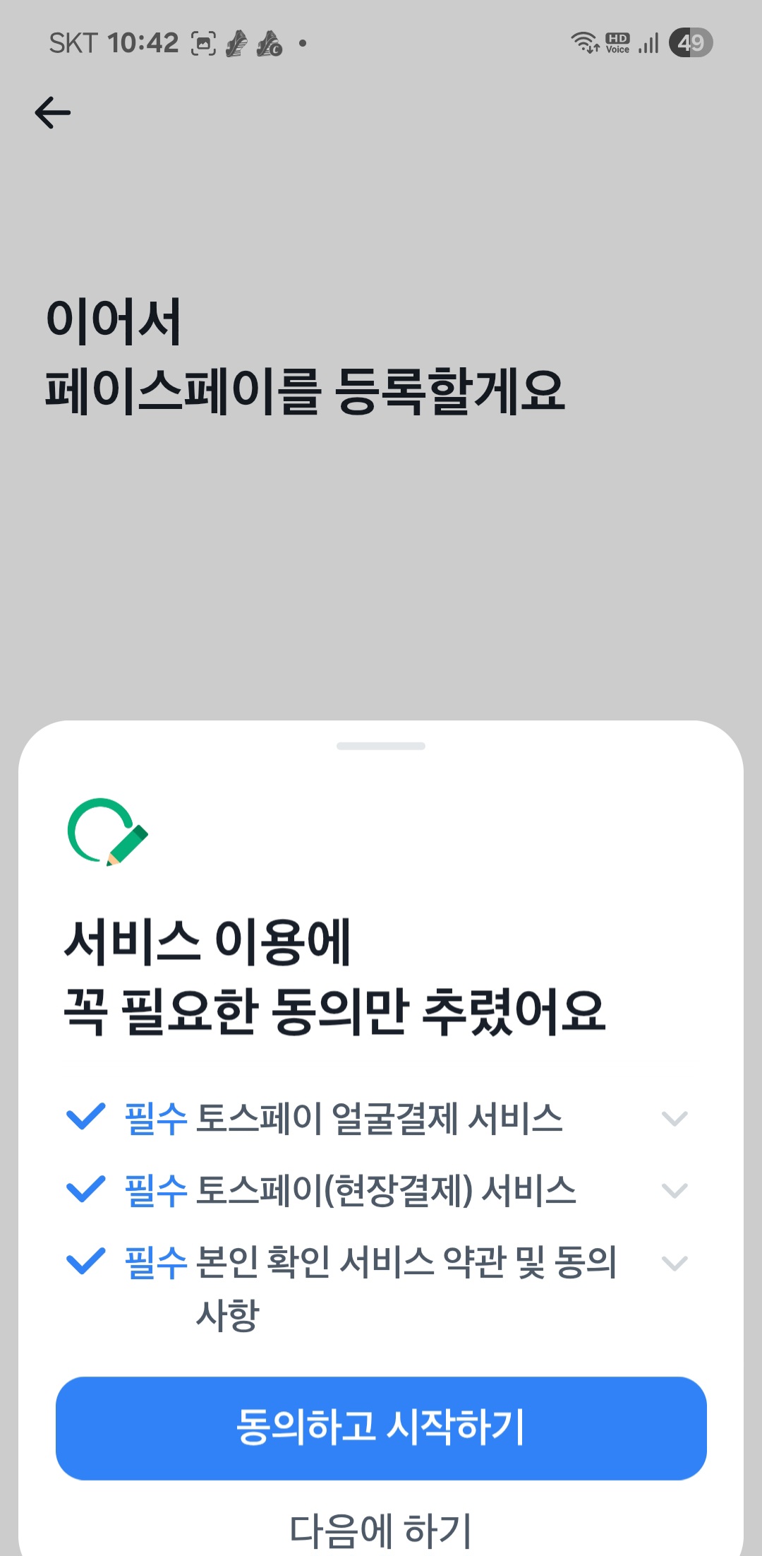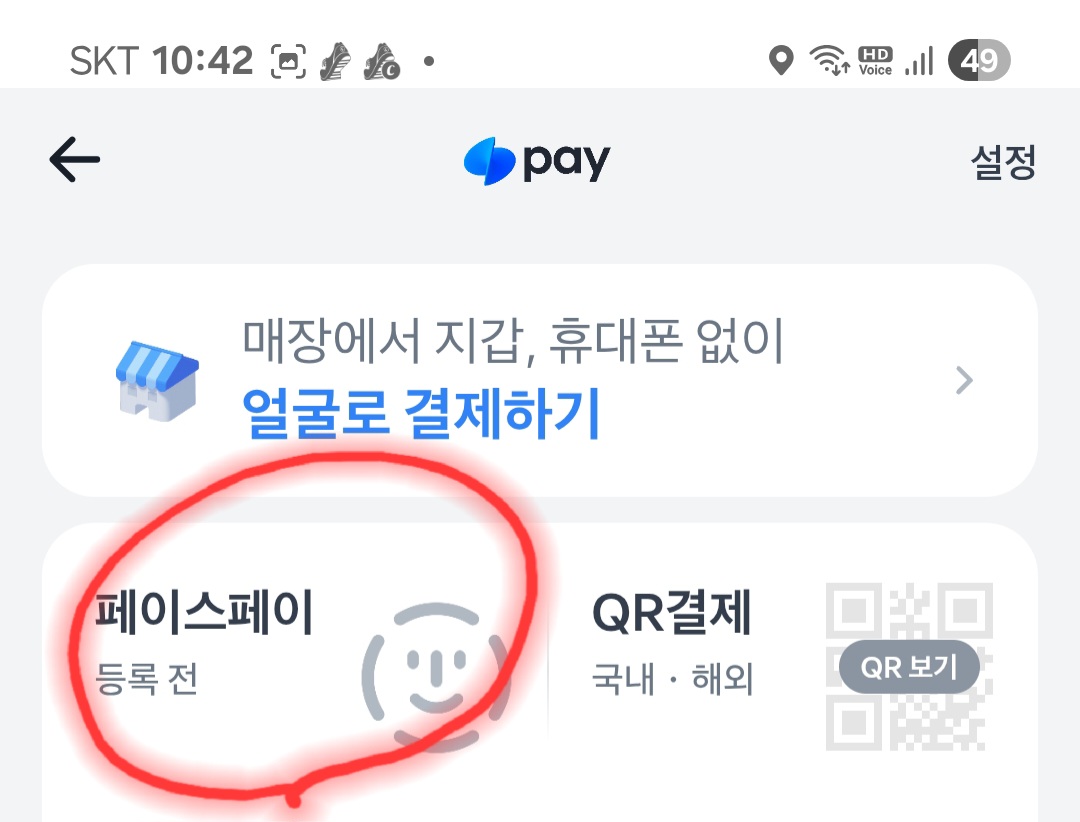 앱 하단 오른쪽의 '전체' 메뉴에 들어가면 중간쯤에 '얼굴 인식으로 결제'라는 메뉴가 보일 거예요. 클릭해서 가입을 시작합니다. - 이용 동의 후 얼굴 등록하기