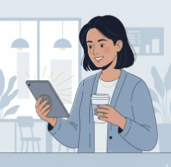 얼굴 등록이 끝나면 결제할 계좌를 연결해요. 이제 준비 완료! 매장 카운터에 "토스 얼굴 결제로 할게요"라고 말하면, 직원분께서 태블릿을 건네줄 거예요. 그 태블릿 화면에 얼굴을 가져다 대면 순식간에 결제가 끝난답니다.