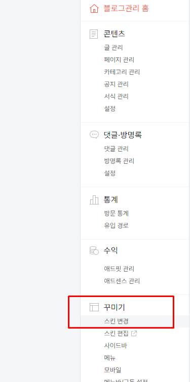 > 블로그관리=> 꾸리미-[스킨변경]클릭=>스킨목록 적용