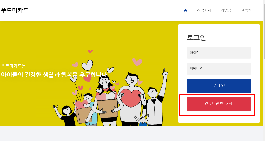 사이틀 접속하면 오른쪽 아래 빨간색 간편잔액조회 클릭