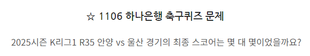 - 유형 1. K리그 및 스폰서 정보: 하나은행은 K리그의 메인 스폰서입니다. 따라서 K리그 일정, 하나은행이 후원하는 하나원큐 팀(예: 대전 하나 시티즌, 전북 현대) 관련 내용이 자주 나옵니다. 이 팀들의 최근 경기 결과나 주요 선수 정보를 미리 파악해두면 좋습니다.