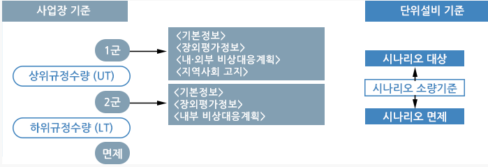 - 기존의 장외영향평가와 위해관리계획을 통합 정비하여 사고 시 외부 영향이 적은 일정규모 미만 취급사업장은 서류제출을 면제하여 사업장의 부담을 완화하고 유해화학물질을 다량 취급하는 대규모 사업장 중심으로 집중 관리하는 제도 입니다