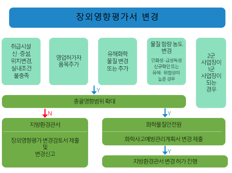 - 화학물질관리법 시행에 따라 유해화학물질 취급시설 설치,운영하려는 자는 유해화학물질 취급시설 착공 전에 장외영향평가가 의무화 되었으며, 기존시설은 유예기간 내에 장외영향평가서를 제출해야 합니다.