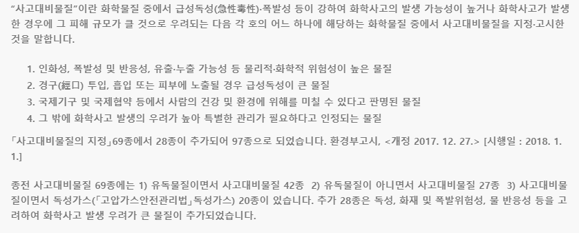 환경부에서 2015년부터 화학물질관리법을 시행하여 유해화학물질/취급시설을 설치, 운영하는 사업장 및 사업장 주변지역의 주민과 환경 등에 미치는 영향과 피해를 최소화하도록, 위험도에 따라 안전성 확보하도록 하며 예방관리 체계를 강화하여 왔습니다.