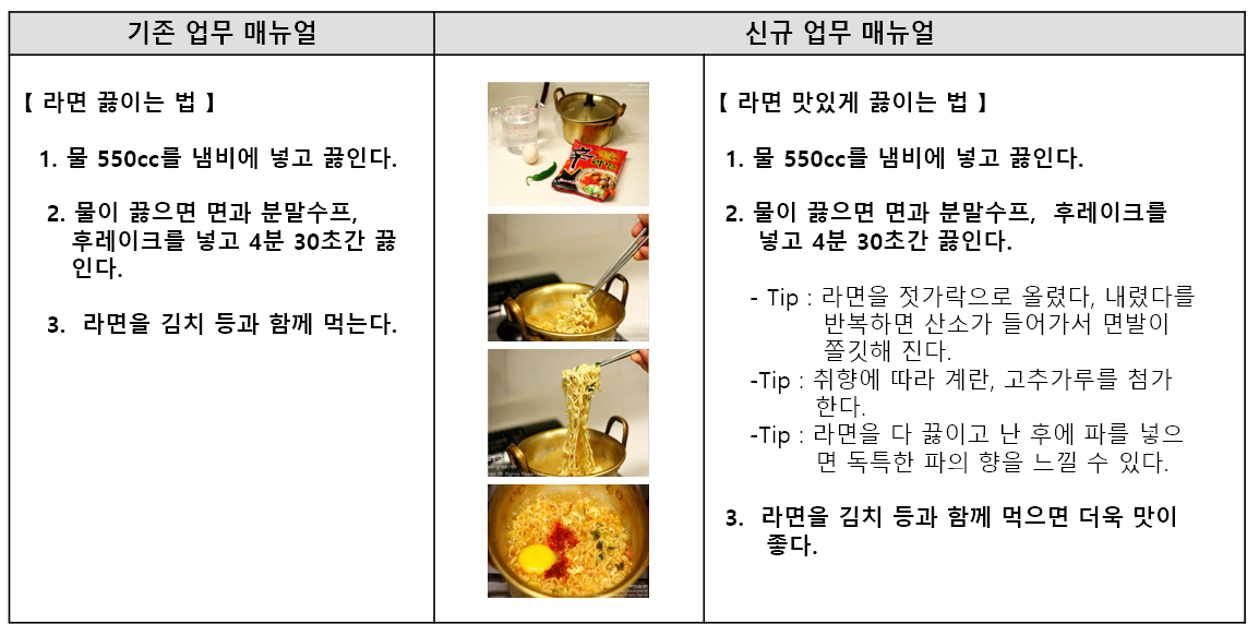 현장경험과 같은 암묵지를 업무매뉴얼 같은 형식지로 만들어 공유하는 방법이예요