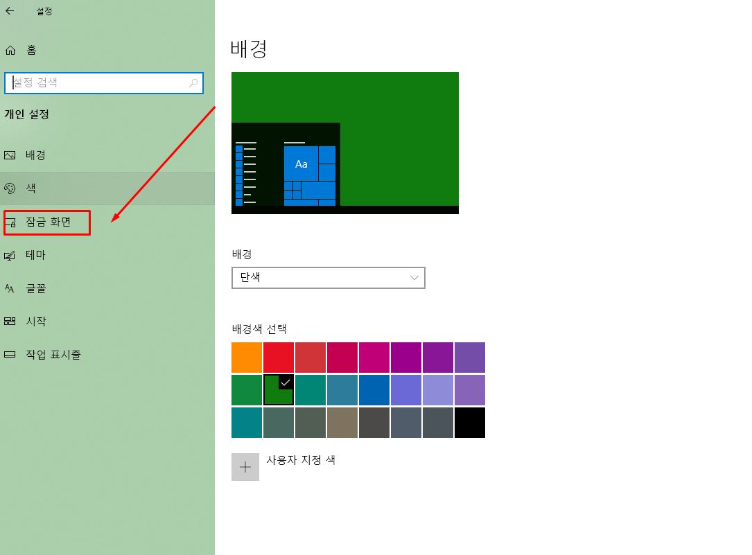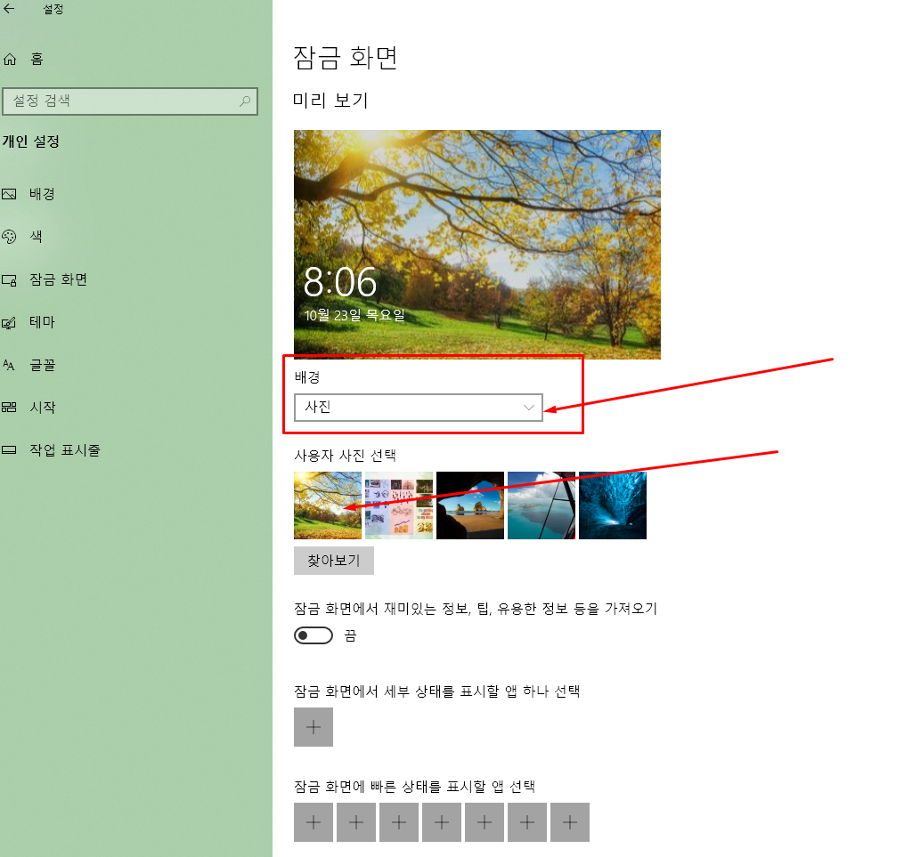 - 왼쪽 메뉴에서 '개인 설정'을 선택하고, 오른쪽에서 '잠금 화면' 항목을 클릭합니다.