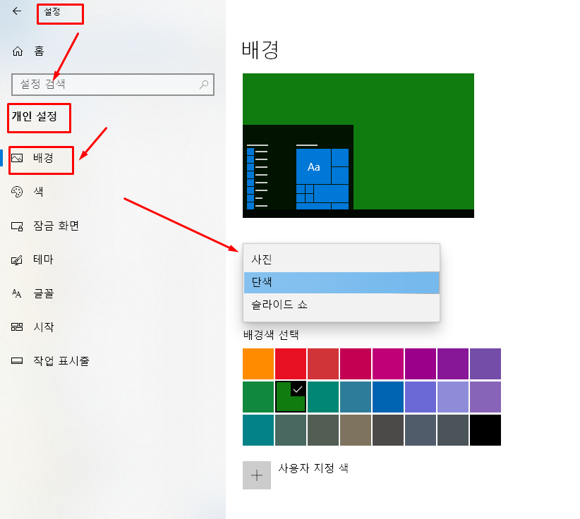 - '배경' 드롭다운 메뉴에서 '사진', '단색', '슬라이드 쇼' 중 하나를 선택합니다.