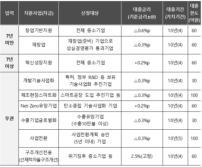 융자 한도 : 중진공 정책자금 대출 잔액과 신규 대출 예정액을 합산하여 기업당 60억원 이내에서 운용