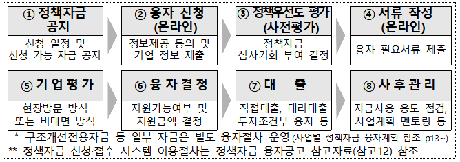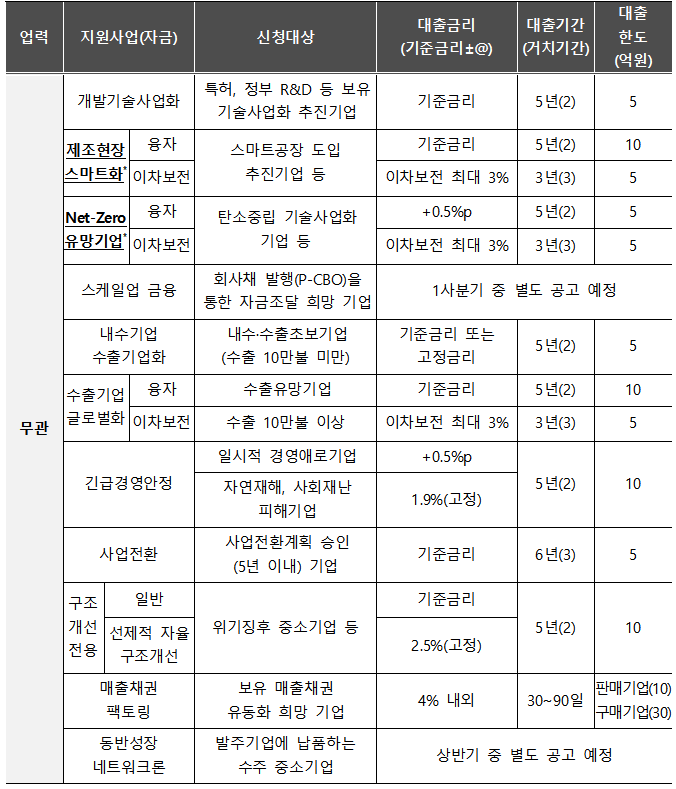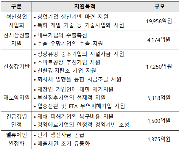 지원대상 : 고용창출, 수출·매출증대 등 성과창출 기업, 시설투자 기업,중점지원분야(혁신성장분야,뿌리산업, 뿌리기술,소재‧부품‧장비산업,지역주력산업) 등 영업위기에 정책자금 우선 지원