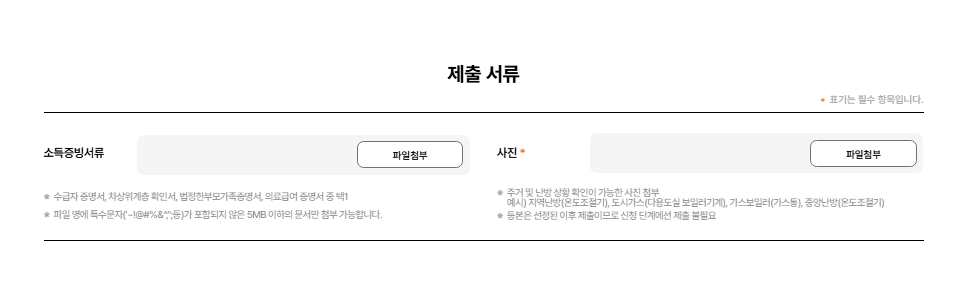 - 주거 및 난방 상황 사진: (보일러, 온도조절기, 난방 기계 등 주거 환경이 확인 가능한 사진 1장 이상) 난방 시설이 노후되었거나, 단열이 취약해 보이는 사진이라면 더 좋습니다. 현재 살고 계신 집의 상황을 보여주는 것이 중요해요.