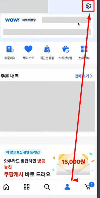 - 마이쿠팡 화면 우측 상단에 있는 톱니바퀴 모양 아이콘 (설정)을 터치하여 설정 화면으로 진입합니다.