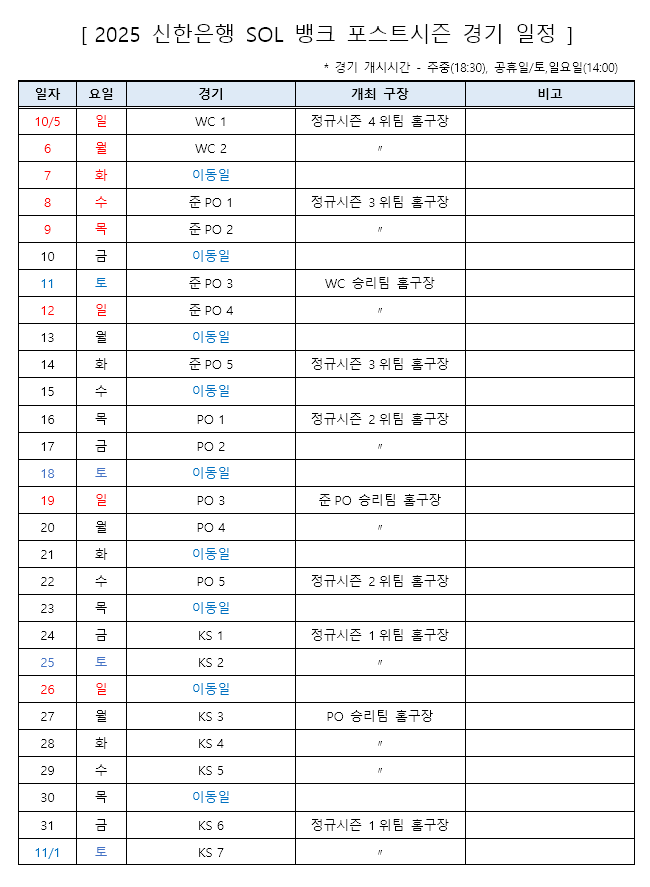 | 플레이오프 일정 | 1차전: 10/16(목) 18:30 |