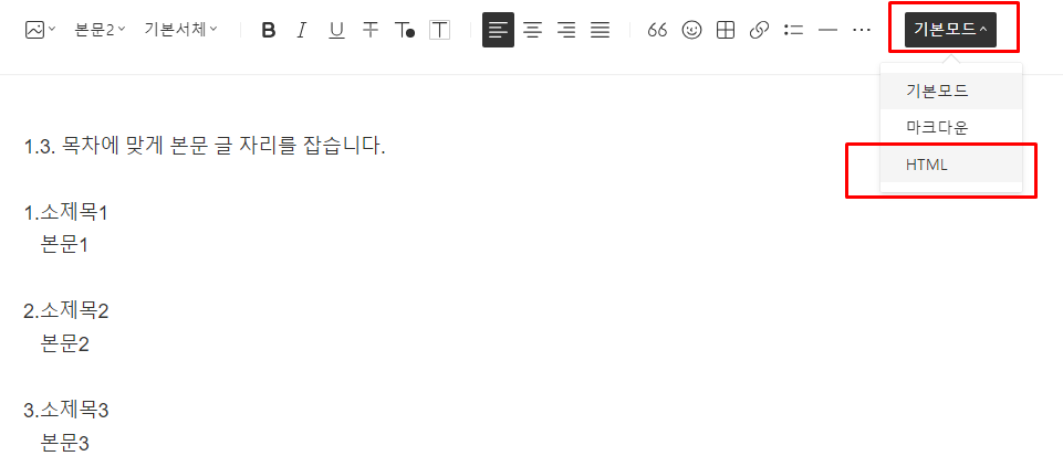 1.3. 목차에 맞게 본문 글 자리를 잡습니다.