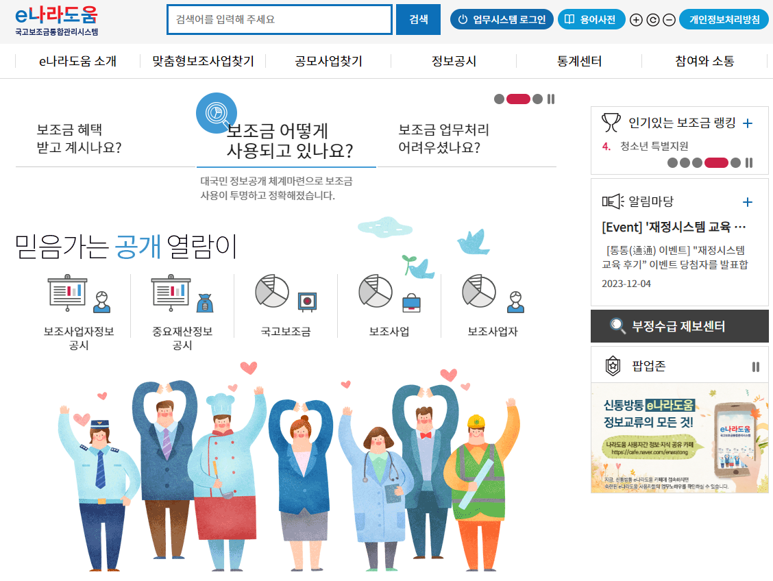 국고보조금의 예산편성 교부 집행 정산등의 보조금 처리 전 과정을 전자화 정보화하여 통합 관리 함으로써 보조금 예산이 꼭 필요한 사람에게 효율적으로 쓰이도록 관리하는 시스템